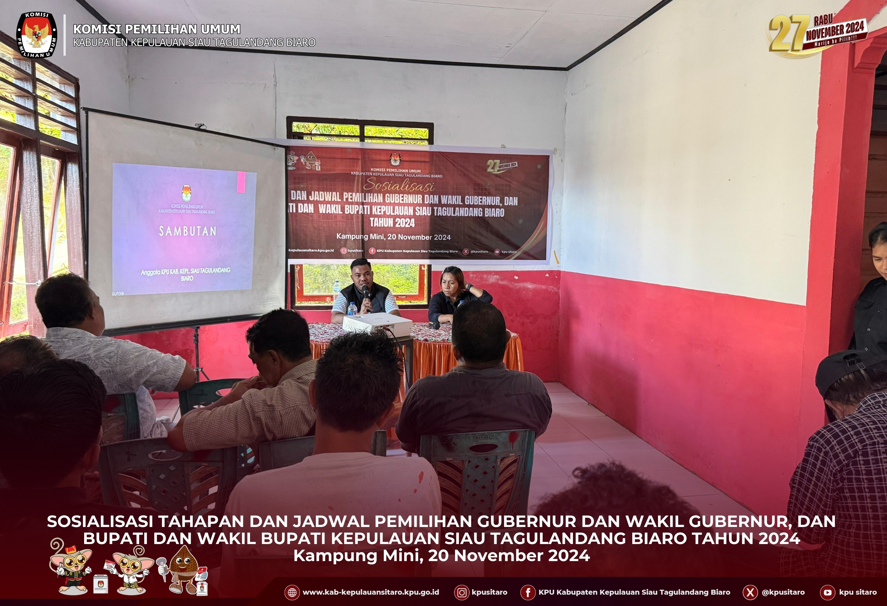 KPU Kabupaten Kepulauan Siau Tagulandang Biaro Menyelenggarakan Sosialisasi Jadwal dan Tahapan Pemilihan Gubernur dan Wakil Gubernur, Bupati dan Wakil Buoati serta Walikota dan Wakil Walikota di Kampung Mini Kecamatan Siau Barat Utara pada Rabu 20 November 2024.