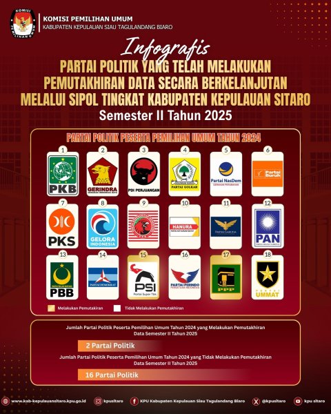 KPU Kabupaten Kepulauan Siau Tagulandang Biaro memverifikasi bahwa pada Semester II Tahun 2025, terdapat 2 Partai Politik Peserta Pemilu yang melakukan pemutakhiran data secara berkelanjutan melalui Sistem Informasi Partai Politik (SIPOL) tingkat Kabupaten Kepulauan Siau Tagulandang Biaro, yaitu Partai Solidaritas Indonesia (PSI) dan Partai Persatuan Pembangunan (PPP).