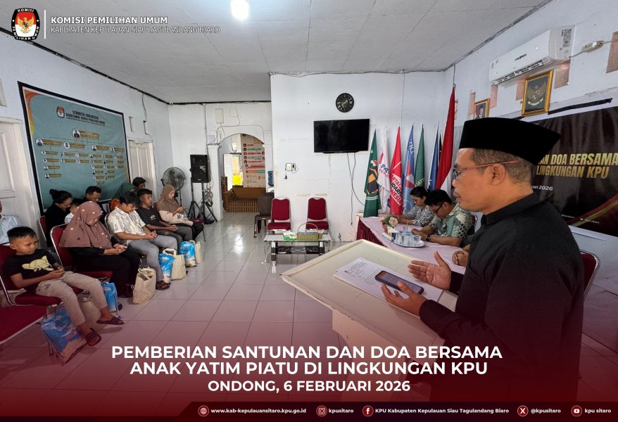 Komisi Pemilihan Umum (KPU) Kabupaten Kepulauan Siau Tagulandang Biaro menggelar kegiatan santunan dan doa bersama anak yatim di Kantor KPU Sitaro, Jumat (6/2/2026).