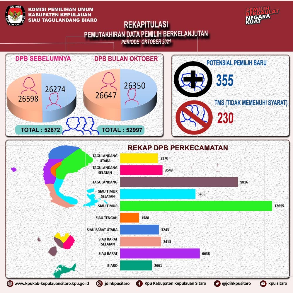 Dalam Rakor Tamaka memaparkan bahwa untuk pemilih tidak memenuhi syarat (TMS) sebanyak 230 terdiri dari pemilih meninggal berjumlah 126 dan pemilih pindah keluar Kab. Sitaro 104 pemilih, sedangkan untuk potensial pemilih baru sejumlah 355 pemilih terdiri atas pemilih genap usia 17 tahun di bulan Oktober 2021 berjumlah 105 dan pindah masuk ke Kab. Sitaro sebanyak 250 pemilih, sehingga dalam Rakor KPU menetapkan untuk rekapitulasi daftar pemilih berkelanjutan periode Oktober 2021 sebanyak 52.997 pemilih yg terdiri dari pemilih laki-laki 26.350 dan perempuan 26.647 pemilih, sehingga untuk daftar pemilih berkelanjutan bulan Oktober 2021 ketambahan sebanyak 125 pemilih dibanding dengan daftar pemilih berkelanjutan bulan sebelumnya berjumlah 52.872 pemilih. Tamaka menambahkan bahwa Pemutakhiran data berkelanjutan selain bertujuan untuk memperbaharui data pemilih juga dilakukan guna mempermudah proses pemutakhiran data dan penyusunan daftar pemilih pada Pemilu/Pemilihan berikutnya.