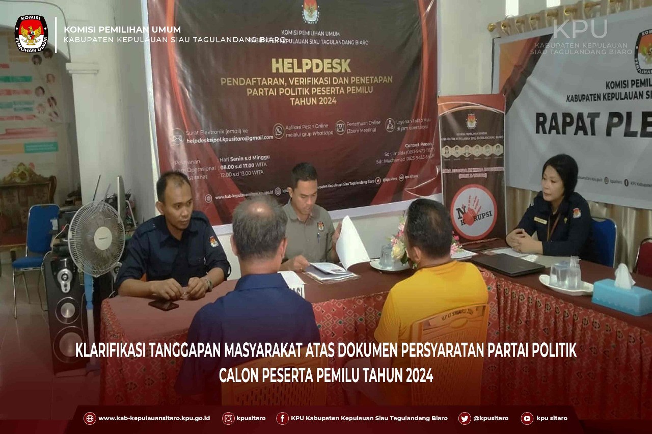 Ondong Siau - Berdasarkan ketentuan pasal 140 Peraturan Komisi Pemilihan Umum Nomor 4 Tahun 2022 tentang Pendaaftaran, Verifikasi dan penetapan Partai Politik Peserta Pemilu, serta Surat Ketua KPU RI Nomor 670/PL.01.1-SD/05/2022 perihal tanggapan Masyarakat, KPU Kab. Kep. Siau Tagulandang Biaro melakukan klarifikasi sebagai tindak lanjut laporan tertulis/tanggapan masyarakat terkait keabsahan dokumen persyaratan partai politik yang disampaikan melaui info pemilu kepada instansi yang berwenang.