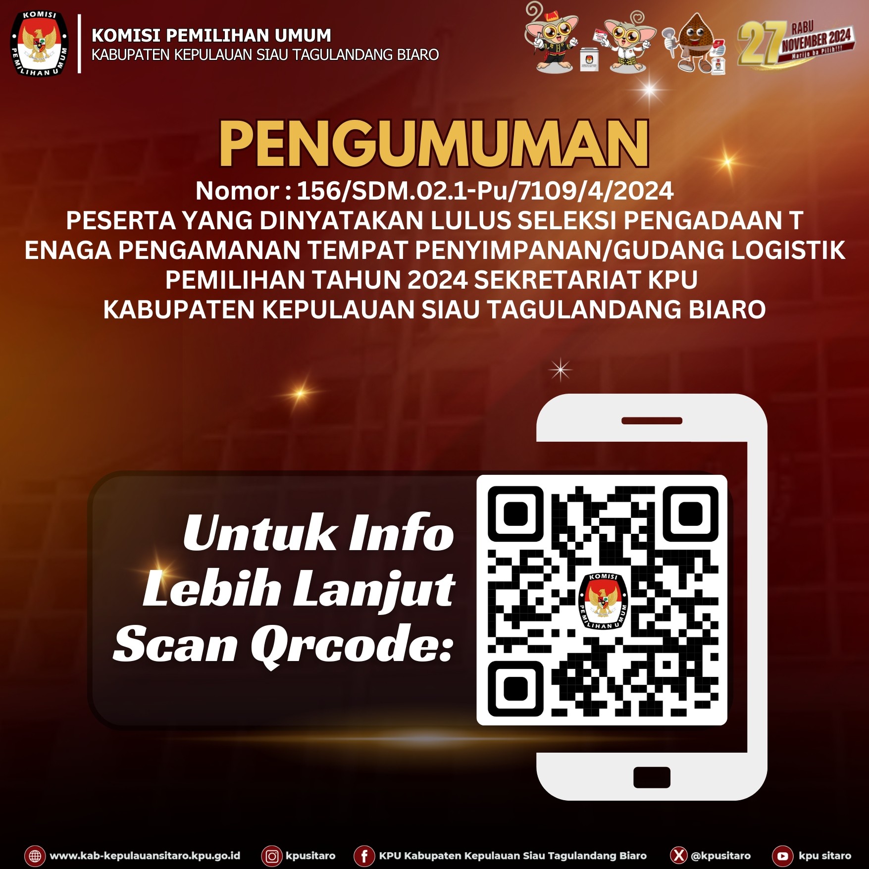Berikut Pengumuman Peserta yang Dinyatakan Lulus Seleksi Pengadaan Tenaga Pengamanan Tempat Penyimpanan/Gudang Logistik Pemilihan Tahun 2024 Sekretariat KPU Kabupaten Kepulauan Siau Tagulandang Biaro berdasarkan Hasil Seleksi Wawancara yang dilaksanakan pada hari Jumat 11 Oktober 2024 yang bertrmpat di kantor KPU Kabupaten Kepulauan Siau Tagulandang Biaro.