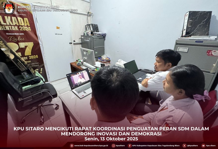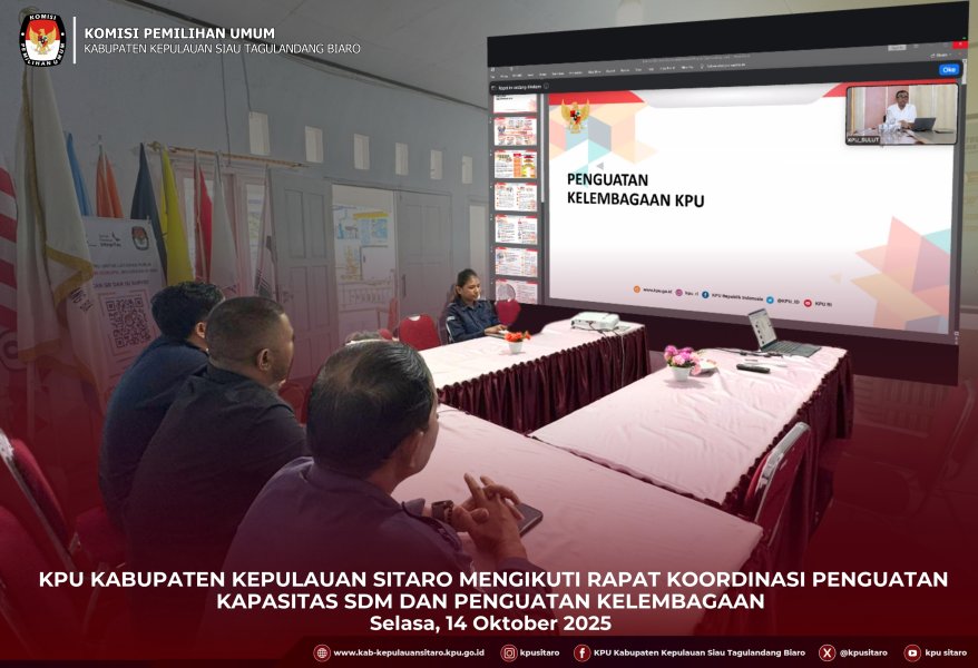 KPU Kabupaten Kepulauan Siau Tagulandang Biaro (Sitaro) mengikuti Rapat Koordinasi Penguatan Kapasitas SDM dan Penguatan Kelembagaan yang dilaksanakan oleh KPU Provinsi Sulawesi Utara secara daring, Selasa (14/10/2025) di Kantor KPU Sitaro. Kegiatan ini bertujuan untuk memperkuat sinergitas antara pengelolaan sumber daya manusia dan kelembagaan di lingkungan KPU, sebagai tindak lanjut dari rapat koordinasi nasional yang sebelumnya telah digelar. Ketua KPU Provinsi Sulawesi Utara, Kenly Poluan, dalam arahannya menyampaikan bahwa penguatan kelembagaan merupakan bagian penting dan wajib dilakukan secara rutin, bukan sekadar formalitas. “Kegiatan ini menjadi langkah penting sebagai tindak lanjut dari kegiatan Rapat Koordinasi Penguatan Peran SDM yang digelar oleh KPU RI. Konsolidasi dan penguatan kelembagaan bukan sekadar sebagai bentuk tindak lanjut, melainkan merupakan kewajiban institusional yang perlu dilakukan secara berkelanjutan untuk menjaga soliditas dan kesiapan lembaga, “ujarnya. Ia juga menambahkan bahwa segala perencanaan dan evaluasi harus dilakukan secara matang untuk memastikan kesiapan lembaga dalam menyongsong agenda kepemiluan mendatang. Sementara itu, Sekretaris KPU Provinsi Sulawesi Utara, Meidy Malonda, dalam sambutannya menekankan pentingnya sinergi antara SDM yang berkualitas dan kelembagaan yang kuat. “SDM yang berkualitas dan lembaga yang kuat sangat diperlukan agar tujuan organisasi dapat tercapai dengan baik, “pungkasnya. Anggota KPU Provinsi Sulawesi Utara Divisi Sosialisasi Pendidikan Pemilih Partisipasi Masyarakat, dan SDM Awaluddin Umbola, turut menyampaikan bahwa kegiatan ini menjadi momentum penting bagi seluruh jajaran KPU untuk memperkuat kapasitas individu sekaligus mempererat koordinasi kelembagaan. “Penguatan SDM dan kelembagaan tidak hanya sebatas teori, tetapi harus diimplementasikan dalam kerja nyata di lapangan. Melalui kegiatan seperti ini, kita dapat memperkuat komitmen bersama dalam membangun lembaga yang profesional, transparan, dan berintegritas,” jelas Umbola. Dalam kesempatan ini juga Kadiv Sosdiklih Parmas dan SDM KPU Provinsi Sulawesi Utara Awaluddin Umbola turut menyampaikan materi terkait Penguatan Lembaga KPU. Kegiatan ini diikuti oleh Ketua Divisi Sosdiklih Parmas dan SDM KPU Kab. Kepl. Siau Tagulandang Biaro, Vicri R. Lahansang, S.IP, Sekretaris KPU Nelwan Maloring, SH.,MH, Kepala Subbagian Parmas dan SDM Fedryanus Z. Tendean, SE dan dan operator. Melalui kegiatan ini, diharapkan seluruh satuan kerja di lingkungan KPU dapat memperkuat kapasitas, sinergitas, dan integritas kelembagaan guna mewujudkan penyelenggaraan Pemilu yang profesional, akuntabel, dan berintegritas.