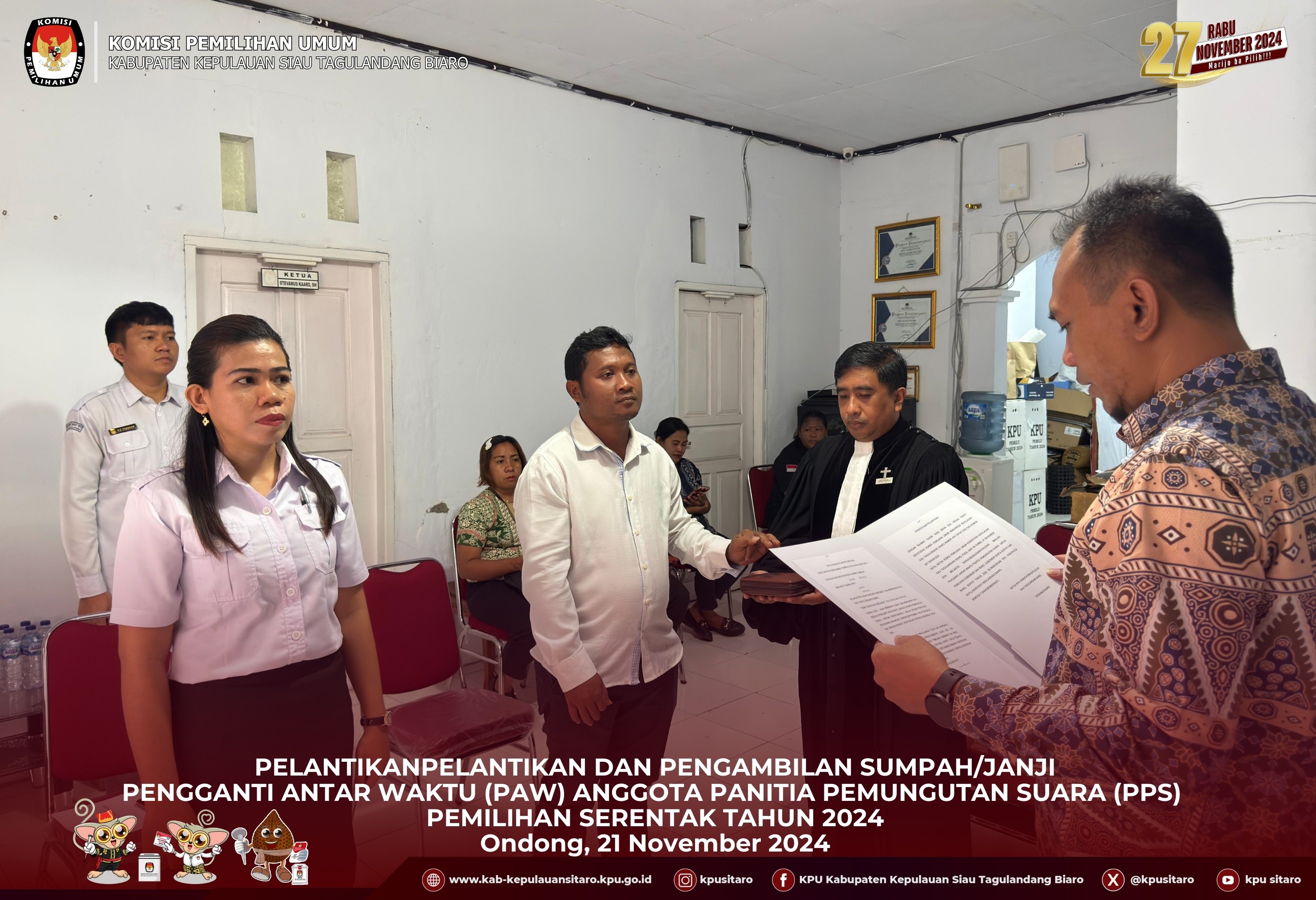 Komisi Pemilihan Umum Kabupaten Kepulauan Siau Tagulandang Biaro melaksankan kegiatan Pelantikan dan Pengambilan Sumpah/Janji Pengganti Antar Waktu (PAW) Anggota Panitia Pemilihan Suara untuk Pemilihan Gubernur dan Wakil Gubernur serta Bupati dan Wakil Bupati pada Kabupaten Kepulauan Siau Tagulandang Biaro Tahun 2024, bertempat di Kantor KPU, Kamis, (22/11/2024).