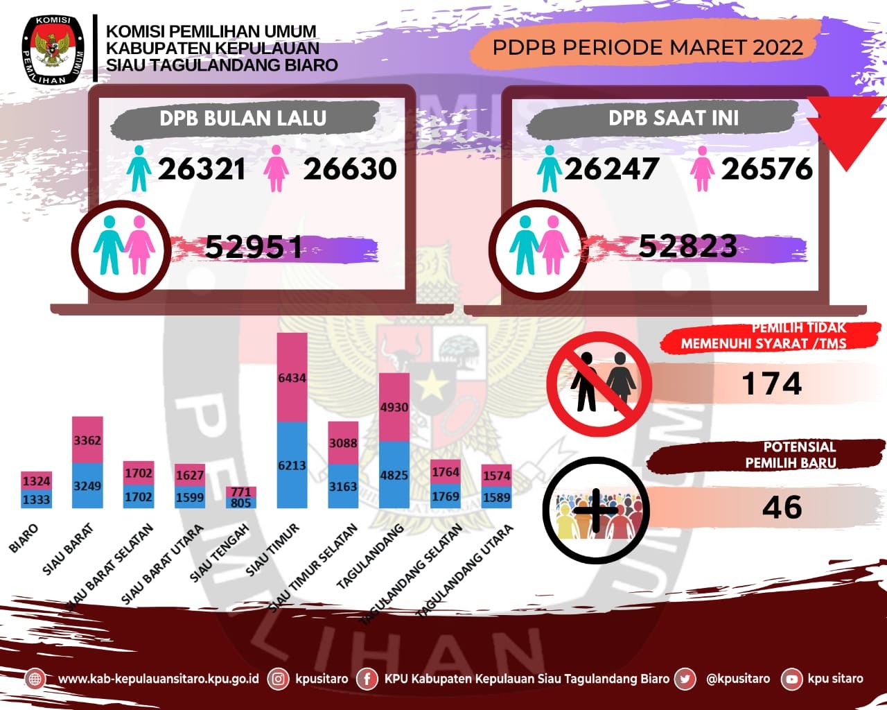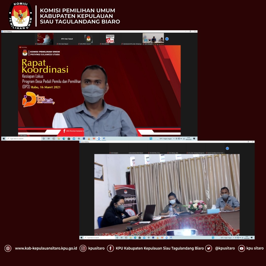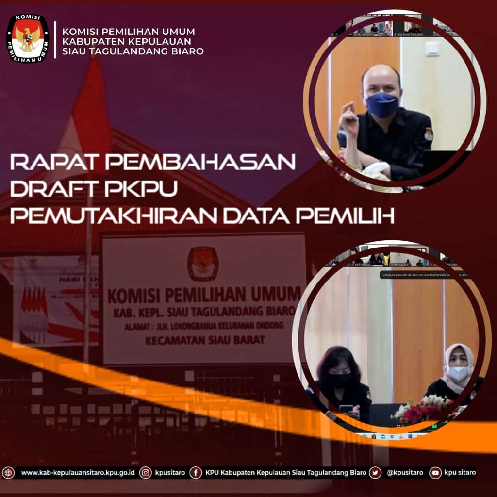 Ondong Siau- Pada hari Rabu, 30/03/2022 KPU Kabupaten Kepulauan Siau Tagulandang Biaro Mengikuti Rapat Pembahasan Draft PKPU Pemutakhiran Data Pemilih Secara daring yang diselenggarakan oleh KPU Provinsi Sulawesi Utara bersama 15 KPU Kabupaten/Kota berdasarkan surat no 98/TIK.04-Und/71/2022, yang dihadiri Ketua Divisi Perencanaan Data Dan Informasi, Kepala Sub Bagian Perencanaan Data dan Informasi serta Operator Sidalih KPU Kabupaten/Kota Se Sulawesi Utara. Kegiatan ini diawali dengan penyampaian dari Sekretaris KPU Provinsi Sulawesi Utara Pujiastuti. Sekretaris KPU Provinsi Sulut dalam penyampaiannya menegaskan pihak sekretariat harus siap dan mendukung sepenuhnya program kegiatan dalam proses tahapan yang akan diselenggarakan yang rencananya akan dimulai Juni 2022 nanti. Selanjutnya Ketua Divisi Hukum dan Pengawasan KPU Sulut selaku Plh.Ketua KPU Sulut Meidy Tinangon dalam arahannya menegaskan bahwa tentunya dalam membahas serta mencermati Draft PKPU ini diharapkan untuk tetap memperhatikan aturan lain terkait daftar pemilih. “tidak hanya membuka rancangannya saja tapi juga harus memperhatikan Undang-undang terkait daftar pemilih”, tegas Tinangon Rapat Pembahasan Draft PKPU Pemutakhiran Data Pemilih dipimpin lasung oleh Ketua Divisi Perencanaan, Data dan Informasi KPU Sulut Lanny Ointu, dan menjelaskan bahwa dalam pembahasan draft PKPU ini untuk tidak hanya melibatkan satu divisi saja, tapi diharapkan juga bisa untuk melakukan telaah bersama dengan divisi hukum dan pengawasan agar bisa mendapatkan kajian hukum yang pasti.