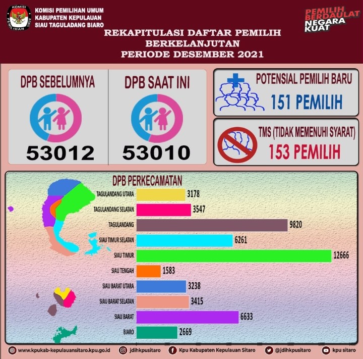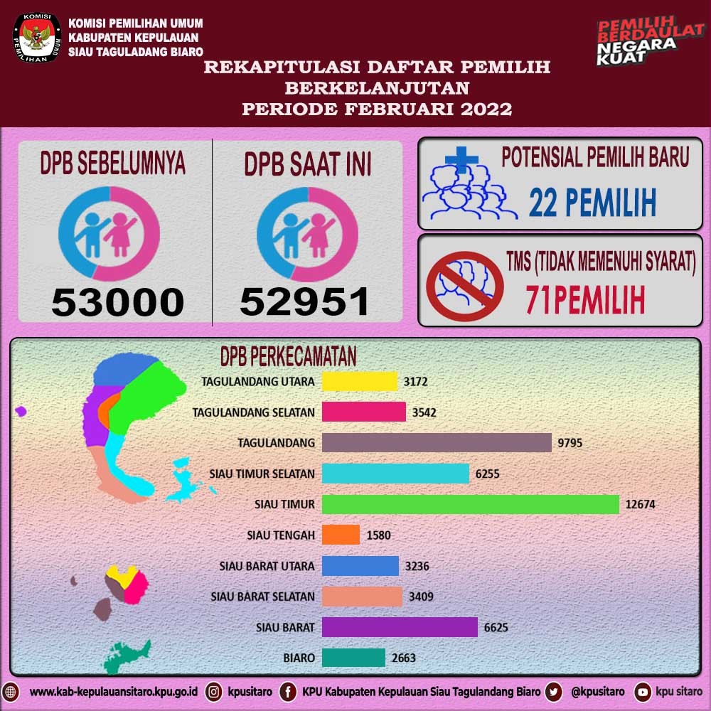 Kamis 03 Februari 2022 KPU Kab. Kepl. Sitaro menyelenggarakan Rapat Pleno Internal terkait Penetapan Pemuktahiran Daftar Pemilih Berkelanjutan (PDPB) periode Januari 2022 yang bertempat di Kantor KPU Kab. Kepl. Sitaro yang dihadiri oleh Ketua, Anggota, dan Sekretaris KPU Kab. Kepl. Sitaro. Rapat rekapitulasi dibuka oleh Ketua KPU Kab. Kepl. Sitaro, Stevanus Kaaro, S.H, dalam sambutannya Kaaro menyampaikan : rekapitulasi pemuktahiran data pemilih sebagai pelaksanaan atas amanat yang tertuang dalam Undang-Undang Nomor 7 tahun 2017 pasal 20 huruf (l) bahwa KPU Kabupaten/kota berkewajiban untuk melakukan pemutakhiran dan memelihara data pemilih secara berkelanjutan dengan memperhatikan data kependudukan sesuai dengan ketentuan peraturan perundangan yang pelaksanaannya secara teknis diatur dalam Surat Ketua KPU RI No. 366 tahun 2021 perihal perubahan Surat Ketua KPU RI no. 132/PL.02-SD/01/KPU/II/2021 tentang Pemuktahiran Data Pemilih Berkelanjutan Tahun 2021, dan yang terbaru PKPU No. 6 tahun 2021 tentang Pemuktahiran Daftar Pemilih Berkelanjutan, dengan harapan bahwa dengan adanya PDPB dapat menghasilkan data pemilih yang akurat dan mutakhir agar meningkatkan kualitas penyelenggaraan pesta demokrasi. Hasil PDPB dipaparkan oleh Ketua Divisi Perencanaan, Data dan Informasi KPU Kab. Kepl. Sitaro, Arther N. Tamaka, S.IP, M.Si, bahwa dalam proses Pemuktahiran Data Pemilih Berkelanjutan periode Januari 2022 didasarkan pada data yang diterima dari Dinas Dukcapil terkait dengan data kependudukan di Kab. Kepl. Sitaro. DPB hasil pemutakhiran periode Desember yang ditetapkan dalam Pleno Internal yaitu 53.000 pemilih, dengan rincian 26.349 pemilih laki-laki dan 26.651 pemilih perempuan yang tersebar di 10 kecamatan dan 93 desa/kelurahan se-Kab. Kepl. Sitaro. Hasil PDPB periode Januari 2022 selanjutnya ditetapkan dalam Berita Acara untuk selanjutnya diserahkan kepada pihak Bawaslu, Dinas Dukcapil, perwakilan Partai Politik di wilayah Kab. Kepl. Sitaro. serta dipublikasi di website & media sosial KPU Kab. Kepl. Sitaro