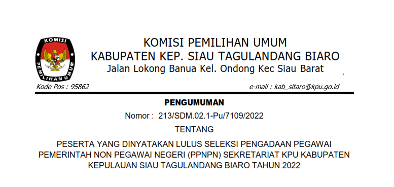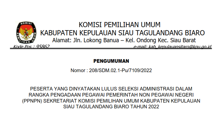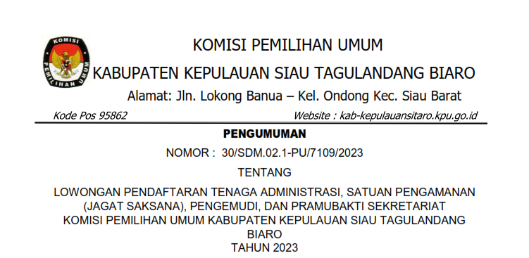 Ondong Siau - Sekretaris Komisi Pemilihan Umum Kabupaten Kepulauan Siau Tagulandang Biaro memberi kesempatan kepada putra-putri terbaik bangsa untuk menjadi Tenaga Administrasi, Satuan Pengamanan (Jagat Saksana) pada Sekretariat KPU Kabupaten Kepulauan Siau Tagulandang Biaro Tahun Anggaran 2023, dengan ketentuan sebagai berikut :