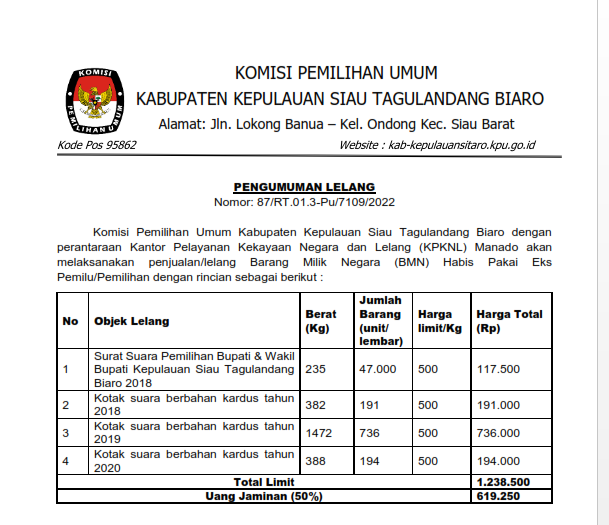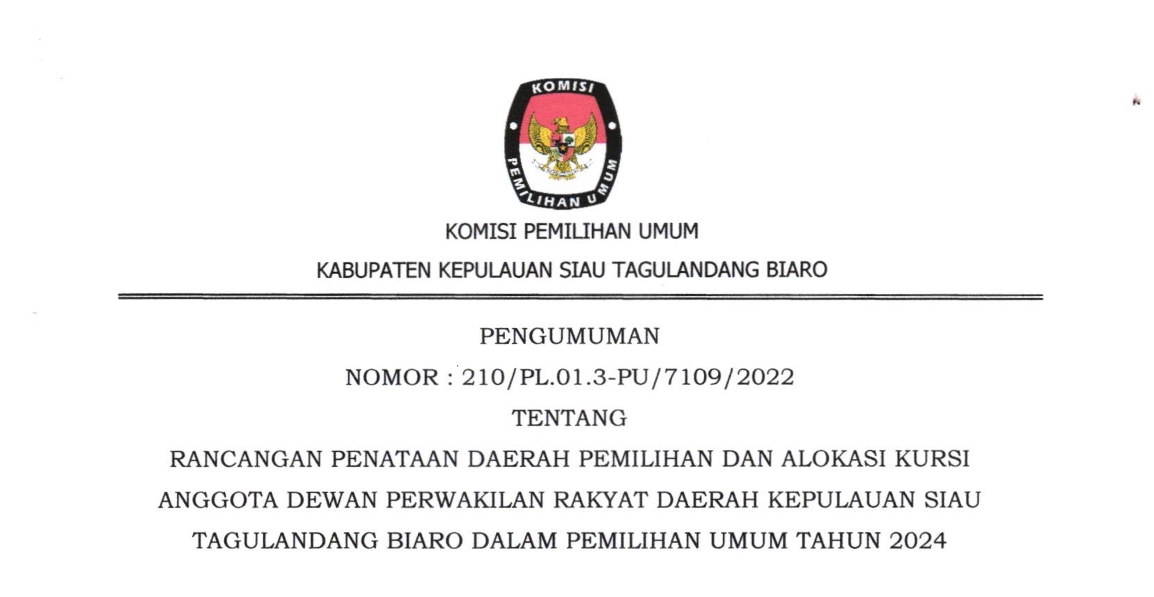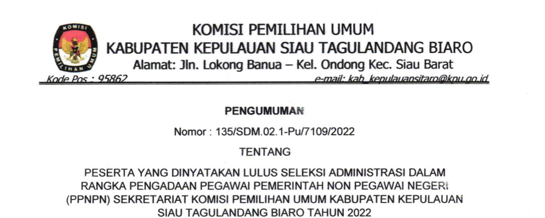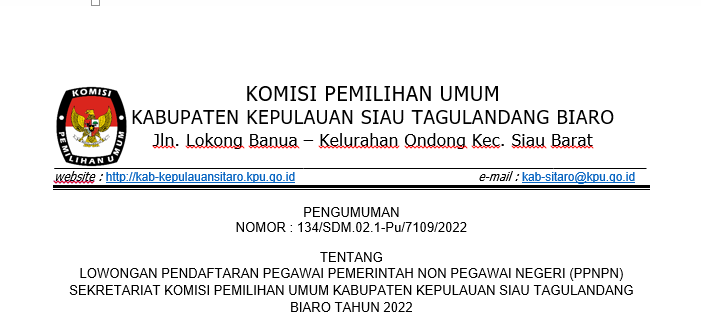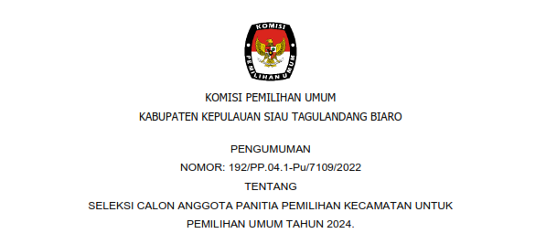 Ondong Siau - Dalam rangka pembentukan Calon Anggota Panitia Pemilihan Kecamatan untuk Pemilihan Umum, Komisi Pemilihan Umum Kabupaten Kepulauan Siau Tagulandang Biaro mengundang Warga Negara Indonesia yang memenuhi kualifikasi untuk mendaftarkan diri menjadi anggota Panitia Pemilihan Kecamatan untuk Pemilihan Umum dengan ketentuan sebagai berikut: Persyaratan Anggota PPK: Warga negara Indonesia; berusia paling rendah 17 (tujuh belas) tahun. setia kepada Pancasila sebagai dasar Negara, Undang-Undang Dasar Negara Republik Indonesia Tahun 1945, Negara Kesatuan Republik Indonesia, Bhinneka Tungga Ika, dan cita-cita Proklamasi 17 Agustus 1945; mempunyai integritas, pribadi yang kuat, jujur dan adil; tidak menjadi anggota Partai Politik yang dinyatakan dengan surat pernyataan yang sah, atau paling singkat 5 (lima) tahun tidak lagi menjadi anggota partai politik yang dibuktikan dengan surat keterangan dari pengurus partai politik yang bersangkutan; berdomisili dalam wilayah kerja PPK; mampu secara jasmani, rohani, dan bebas dari penyalahgunaan narkotika; berpendidikan paling rendah sekolah menengah atas atau sederajat; dan tidak pernah dipidana penjara berdasarkan putusan pengadilan yang telah memeroleh kekuatan hukum tetap karena melakukan tindak pidana yang diancam dengan pidana penjara 5 (lima) tahun atau lebih. Kelengkapan Dokumen Persyaratan: Surat pendaftaran sebagai calon anggota PPK, yang formatnya menggunakan format yang sebagaimana tercantum dalam Lampiran I pengumuman ini; Fotokopi Kartu Tanda Penduduk untuk persyaratan huruf a, huruf b, dan huruf f; Fotokopi ijazah sekolah menengah atas/sederajat atau ijazah terakhir yang dilegalisasi oleh pejabat yang berwenang atau Surat keterangan dari lembaga pendidikan formal yang menyatakan bahwa yang bersangkutan sedang menjalani pendidikan sekolah menengah atas/sederajat untuk persyaratan huruf h; Surat pernyataan untuk persyaratan huruf c, huruf e, huruf g, dan huruf i, merupakan satu dokumen Surat Pernyataan sebagaimana tercantum dalam Lampiran II Pengumuman ini; Surat keterangan sehat jasmani dan rohani untuk persyaratan huruf g yang dikeluarkan oleh puskesmas, rumah sakit, atau klinik yang termasuk di dalamnya terdapat pemeriksaan tekanan darah, kadar gula darah, dan kolesterol; Daftar Riwayat Hidup sebagaimana tercantum dalam Lampiran III Pengumuman ini; dan Pas Foto Berwarna 4x6. Kelengkapan dokumen dapat disampaikan kepada KPU Kabupaten Kepulauan Siau Tagulandang Biaro mulai tanggal 20 November sampai 29 November 2022, Pukul 08.00 sampai 17.00 WITA melalui: Pengiriman dokumen persyaratan mandiri melalui siakba.kpu.go.id dan dokumen fisik yang disampaikan pada saat sebelum pelaksanaan tes tertulis; atau Pengiriman dokumen persyaratan secara langsung ke Sekretariat KPU Kabupaten Kepulauan Siau Tagulandang Biaro Alamat : Jln. Lokong Banua Kel. Ondong, Kec. Siau Barat. Kep. Siau Tagulandang Biaro, Kode Pos 95862 Kontak : 0896-7313-9060 (Anita) dan 082394355558 (Muchamad) Demikian pengumuman ini disampaikan, untuk diketahui. Informasi lebih lanjut beserta dokumen pendukung yang harus disiapkan dapat dilihat pada tautan berikut: Pengumuman Penerimaan Panitia Pemilihan Kecamatan 2022