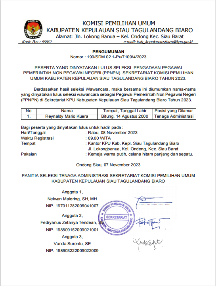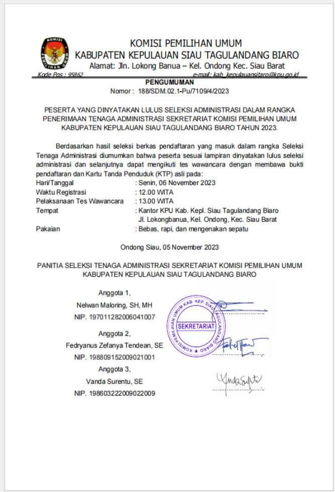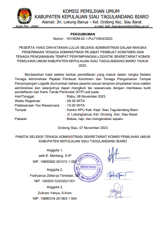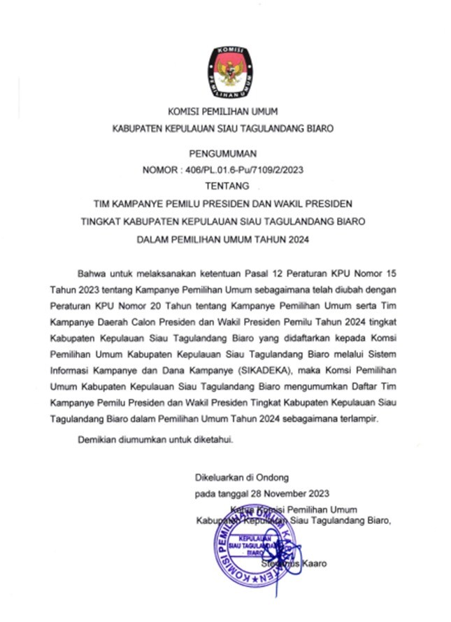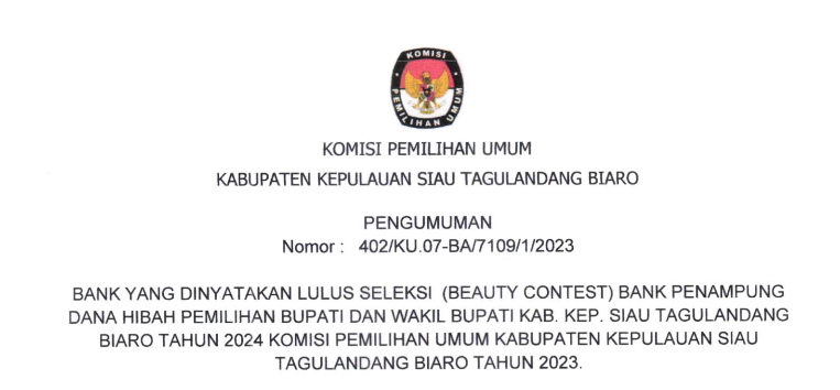 Ondong Siau - #TemanPemilih, Berdasarkan hasil seleksi penilaian, maka bersama ini diumumkan nama bank yang dinyatakan LULUS menjadi Bank Penampung Dana Hibah Pemilihan Bupati & Wakil Bupati Kep. Siau Tagulandang Biaro 2024 pada KPU Kab. Kep. Siau Tagulandang Biaro.