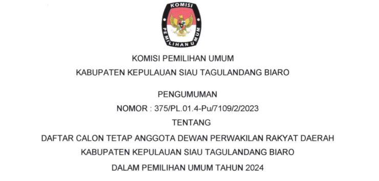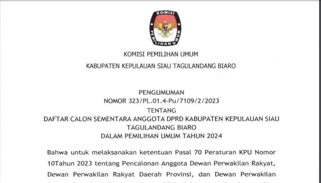 Berdasarkan ketentuan Pasal 70 Peraturan KPU Nomor 10 Tahun 2023 tentang Pencalonan Anggota Dewan Perwakilan Rakyat, Dewan Perwakilan Rakyat Daerah Provinsi, dan Dewan Perwakilan Rakyat Daerah Kabupaten/Kota, maka Kabupaten/Kota, KPU, KPU Provinsi, dan KPU Kabupaten/Kota mengumumkan DCS untuk mendapatkan masukan dan tanggapan KPU Kabupaten Kepulauan Siau Tagulandang Biaro mengumumkan Daftar Calon Sementara (DCS) Anggota DPRD Kabupaten Kepulauan Siau Tagulandang Biaro dan persentase keterwakilan perempuan dalam Daftar Calon Sementara (DCS) sebagaimana dapat diakses melalui :